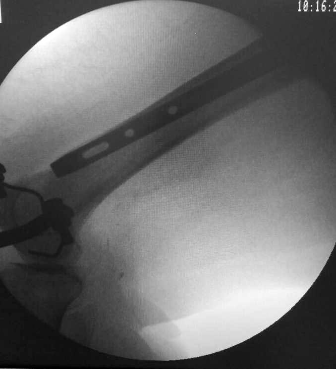 Это длинная псевдограмма, как понимаете, Ее сложно сзади завести, с ЭОПа только эта картинка, я за соседним столиком оперировал, парни пытались погнуть - обломился, в итоге поставили короткую, репозиция примерно такая же, снимки могу завтра -послезавтра выложить. У нас уже были проблемы с этим стержнем в плане переднего Кортекса, да и другие тоже, у них на проксимальный винте не "борозды" , а "царапины" - либо блокировать наглухо либо ротационной стабильности нет, да и прямая как шпага((((