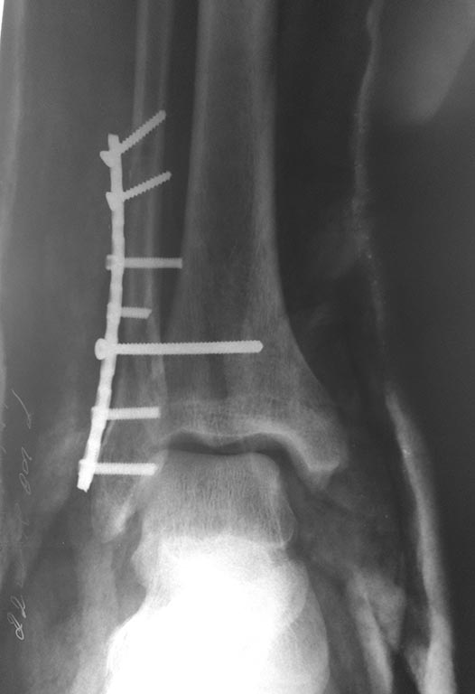 Перелом надсиндесмозный. Лодыжка фиксирована все-таки 2 винтами. а вот синдесмозный винт вроде бы стоит уже в переломе и просто прижимает пластину к большеберцовой кости. на счет реостеосинтеза даже не знаю, но вроде бы послеоперационные снимки сделаны с небольшим вальгусом стопы. Есть ли снимки в нейтральной позиции стопы?