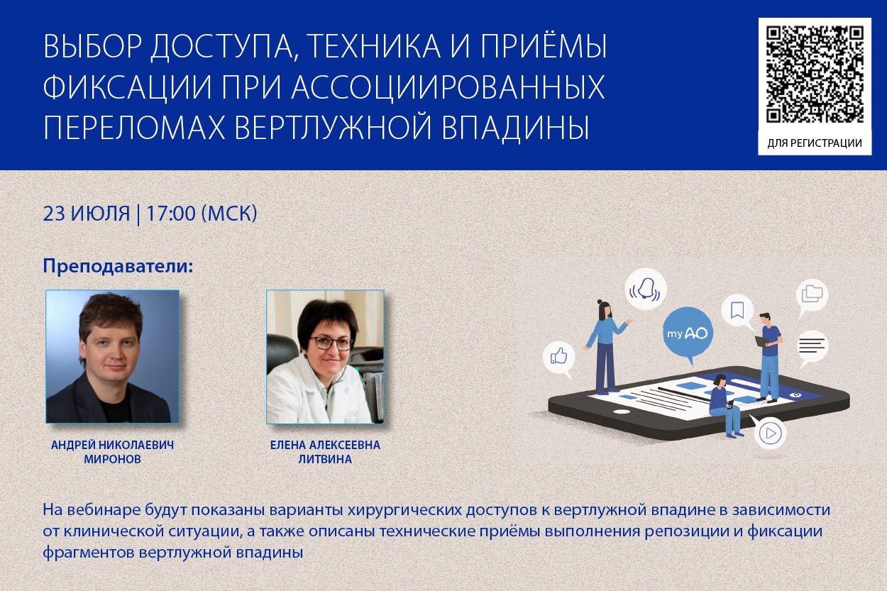 из Уважаемые коллеги, открыта регистрация на второй и третий АО Травма Вебинары 2020 из серии. 23 июля "Выбор доступа, техника и приёмы фиксации при ассоциированных переломах вертлужной впадины" 27 июля