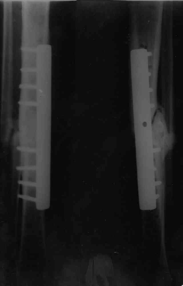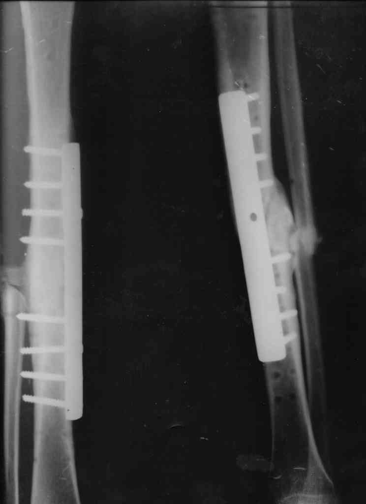 Пластинка для такого типа перелома - плохой выбор, . Весь мир использует для таких переломов внутрикостный стержень, запертый винтами. Стержень вводится без разреза над переломом. Идеально это сделать и сейчас. Сразу возможна полная нагрузка, в силу механики фиксаторов пластина или винты при несращении ломается, стержень нет, и фрагментам деться некуда - он могут только сближаться по стержню. Так что есть смысл сделать такую операцию и сейчас.