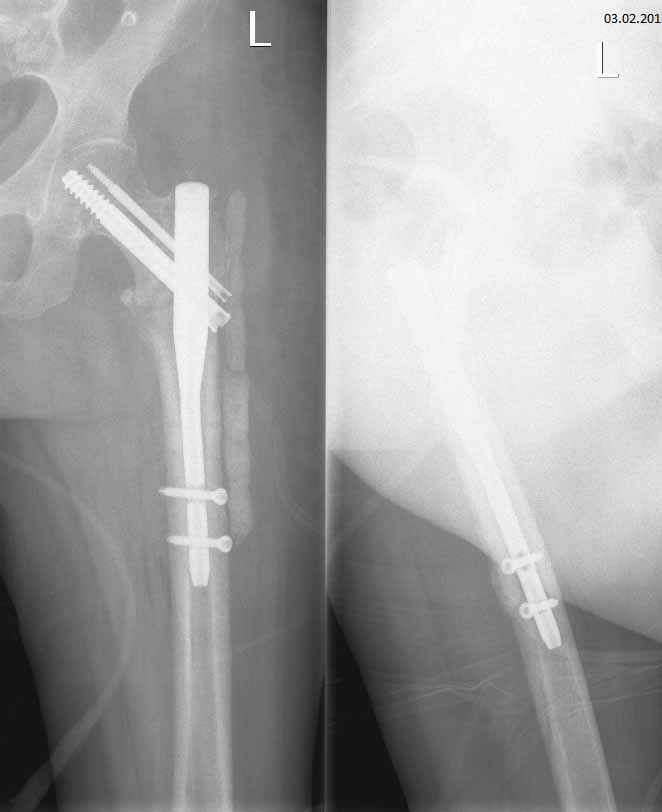 Чрезвертельный перелом левого бедра, в результате ДТП. Женщина 56 лет, ДТП. Чрезвертельный перелом. Было выполнено: скелетное вытяжение- 1 месяц, остеосинтез Г- образной пластиной (Россия), через 4 месяца второй остеосинтез, через 4 месяца вылез винт, выполнена операция- удален один винт, аллопластика. Наложена кокситная повязка. Через 2,5 месяца: щель перелома прослеживается на всем протяжении, склероз по краям отломков. Болей нет. Посоветуйте, что делать дальше, к кому и куда обратиться за помощью. Проживаю в СПб.
