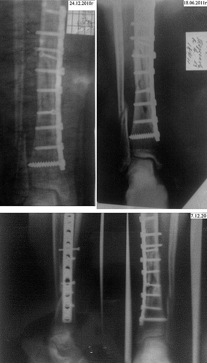 Пациент девушка, 1992 г.р. 11 декабря 2010 годав результате ДТП имеемперелом средней нижней правой третьей большой берцовой кости. операцию сделали 15 декабря 2010, собрали, поставили пластину.Периодические снимки приложены:24.12.2010 - сразу после операции18.06.2011 - промежут. снимок7.12.2011 - последний снимок.Сейчас диагноз звучит так:Диагноз- сросшийся перелом средней нижней правой третьей большой берцовой кости с наличием пластиныХромота, опираться на ногу невозможно,Ходить запрещают, предлагают ждать еще 2 месяца.Есть мнение, что перелом не сросся(?).Просьба прокомментировать адекватность произведенного вмешательства и перспективы,лечение.Вероятно требуется повторное вмешательство. < | >