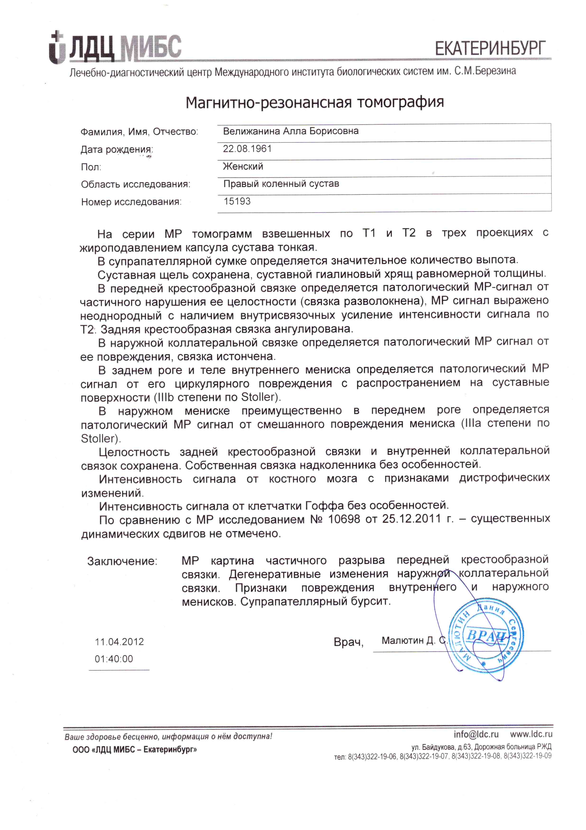 В декабре месяце 2011 г. каталась на сноуборде получила травму правого колена. Сделала МРТ, с результатами пришла на приём к зав. отделением районной травматологии. Выписал: долобене (компрессы, мидокалм (2 нед.), мовалекс (10 дней), детралекс (1мес.) + магнитотерпаия. Всё пропила и сделала. Заключение: МР картина частичного поврежд. крестообраз. связки, наружной коллатеральной связки. Признаки повреждения внутреннего и наружнного менисков. Супрапателлярный бурсит. Носила сначала ортез, потом наколенник с кольцом посередеине, затем совсем простой наколенник. Колено болеть перестало и в конце февраля снова стала плавать и кататься на беговых и горнных лыжах. Правда опять упала на травмированное колено, правд в защите и наколеннике. Был синяк, но само колено не беспокоило. И вдруг 5 апреля колено заболело и всё сильнее и сильнее. Опять чувство наполнения, боль при сгибании, ходьба по лестнице - мучение. Сделал снова МРТ и получила заключение (см. прикреплённый файл) Суть такова что ни каких улучшений вообще нет. Что делать снова проходить тоже лечение. Попыталась записаться на платную консультацию в институт Чаклина, но это 24 мая, а до это как жить. И мне заслушив диагноз по телефону сказали что надо делать операцию, а раньше травматологи говорили что не надо, показаний к этому нет. Кому верить и что делать?Нужна ли операция? И где в Екатеринбурге получить быструю и качественную консультацию грамотного травматолога? < | >