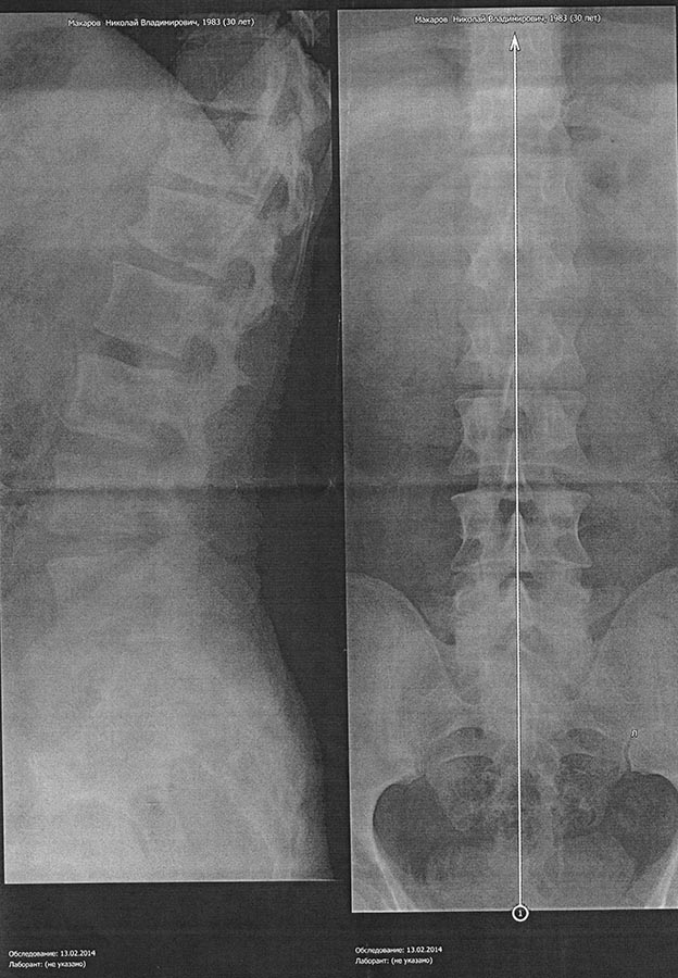 Жалуюсь на постоянные боли в пояснично-крестцовом отделе. Прикладываю снимок в двух проекциях. Мне 30 лет, рост 168, вес 70 кг. Снимали в лежачем положении. Хочется выслушать мнение специалистов. < | >