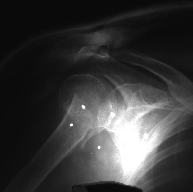 Закрытый перелом хирургической шейки левой плечевой кости со смещением. Выполнена закрытая ручная репозиция. < | >
