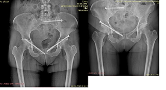 Доброго времени суток! Сочетанная травма в результате ДТП от 15.12.16., закрытая травма таза с ротационно-нестабильным повреждением тазового кольца, переломы обеих лонных, седалищных костей, трансфораминальный перелом боковой массы крестца слева. 46 лет, врач педиатр, производственная травма при выезде к пациенту, пассажир. На КТ от 24.07.17. полной консолидации в крестце ниже винта нет. Извиняюсь за качество снимков, первый от 12.01.17., второй от 18.07.17. С уважением. < | >