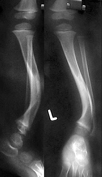 На консультативный прием родители привели ребенка 3 лет с деформацией левой голени. Деформация была выявлена сразу после рождения ребенка и с его развитием усиливается хромота. При ходьбе ребенок полностью наступает на ногу, распределяя нагрузку на внешний край стопы.Нагрузка на ногу безболезненна, данных за травму или инфекцию нет. При осмотре кожных покровов отмечаются характерные пигментные пятна cafeau lait. Совокупность данных анамнеза и осмотра наводит на мысль о нейрофиброматозе с врожденным псевдоартрозом б\б кости. Рентгенограммы прилагаю. Заранее признателен за высказанные мнения по тактике лечения ребенка.С наилучшими пожеланиями,Евгений Чекашкин