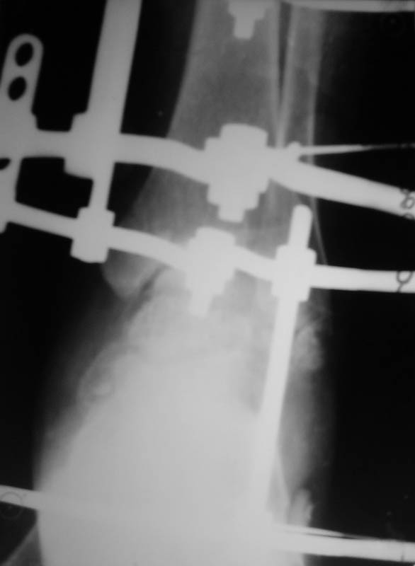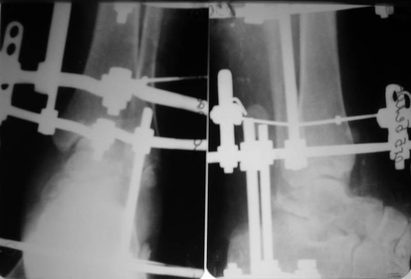 Predvaritelno nalozhit Spanning ExFix, dva 5mm Steinman pin za piatku i verkhnii metaphis tibia. Esli net ExFix obyishnyi apparat Ilizarova iz dvukh kolets