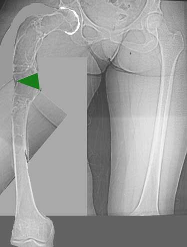 Возможна аппаратная коррекция оси с формированием клиновидного регенерата, которая решила бы и проблему укорочения (что, впрочем, нужно уточнить по схеме, сделанной по рентгенограмме с хорошим захватом смежных суставов - схемка по присланному снимку в приложении). По окончании коррекции - блокируемый стержень, который и сократит время пребывания в аппарате, и вообще возврата к нормальной жизни, а также будет мерой профилактики патологических переломов.