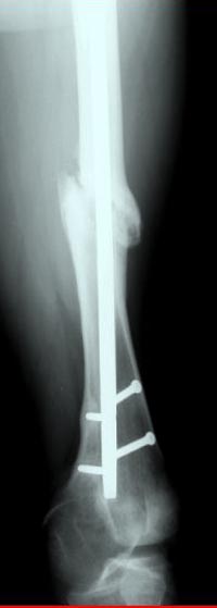 Почему не замена гвоздя с рассверливанием, а аппарат? Из истории болезни: два года назад проперирован по поводу 3А открытого перелома бедра, травма на работе в результате "стена упала на него". Сопутствующая травма: Закрытая травма черепа, перелом голеностопного сустава (прооперериван) и перелом плеча (консервативное лечение) Лечение бедра - ургентное оперативное лечение антеградным с минимально рассверливанием, фиксацией с минимальным диаметром штифта и плюс irrigation and debridment и с закрытием поперечной до 10 см раны на уровне перелома в день поступления. После трех дней начались выделения из ран которые промывалась в палате и рана постепенно закрылась в течение нескольких месяцев. Эмпирически получал 6 недельний курс антибиотика Vancomycin внутривенно. Снимки представлены: 1 мес; 3 мес; 1 год; 2 года, предоперационные и ротационная КТ грамма Деформация: Вальгус- 17 градусов Рекурватум 5 градусов Укорочение 2.5см Ротационно 22 градусов внутренная Смещение диафиза по поперечнику 75% Из трех вариантов: Рассверливание с заменой более большого диаметра штифтом, Остеотомия с фиксацией пластиной+костная пластика, Аппарат Илизарова= Taylor spatial frame Гвоздь для ротационных смещениц был бы идеальным имплантом, после коррекции есть возможность блокировать, но из-за укорочения метод оставил на последнее место. Есть метод Сhaplan лечения ложных суставов бедра, где необходимость bone graft, накладывается феморальный дистрактор и после удаления штифта - рассверливание, через проксимальный канал вводят костный графт в место ложного сустава под рентген контролем, потом вводят штифт, кстати, само рассверливание дейстивует как стимулятор - активизирует восстановительный процесс. Обычный мой первый выбор - вариант с пластиной, - учитывая бывшую инфекцию, открытую травму, посчитал метод менее приемливым. Еще больной был противв костной аутопластики, да и самому тоже хотелось перейти к истокам "откуда мы" более усовершенствованному Курганскому методу. Операцию провели в два этапа, сперва удалили штифт, рассверливание римером на пару мм большего диаметра, определение чувствительности на анаэробную и аэробную культуру (где исследования показали негативный результат чувствительности), через дней десять - начали аппаратную фиксацию.