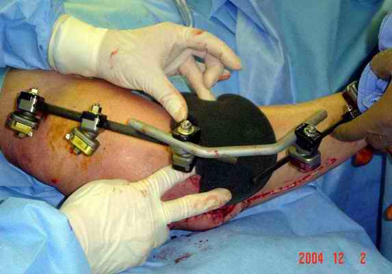 Вторым этапом после 10-12 дней, проводился дебридмент донорского участка и зашивается лоскут на подготовленное ложе после отсечения с одной стороны, одновременная кожная пластика на донорский участок, зашитый лоскут между двумя конечностями страхуется аппаратом или наружным фиксатором любого типа, даже два Steinman pins подходят.