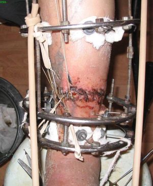 Когда уважаемый д-р Джолдас Кульджанов демонстрировал снимки закрытия раны на голени, у меня лечился больной по поводу открытого переломаголени в н/3 (3Б по Каплану), после вторичной обработки и стабилизации перелома АВФ, нанесены послабляющие разрезы кожи, оставался поперечный дефект кожи голени. Другую часть стягивал с помощью П-образных швов через резиновые трубки. В течение суток П-образные швы снял из-за угрозы прогрессирования некроза. На 4 день начал стягивать этот участок раны с помощью скобок и резиновой стяжки. Рана закрылась через 3 дня, наложил вторичные швы на этот участок. Метод понравился. Возникли вопросы. Какой размер дефекта на голени можно закрывать этим способом? Какая сила тяг наиболее целесообразна? Какой темп стягивания возможен? Сергей Зырянов ЦРБ НСО г.Куйбышев < | >