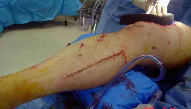 По поводу открытого перелома больной ургентно взят на ретроградное интрамедулярное штифтование, после рутинного дебрайдмента и фасциотомии на бедре и на голени.