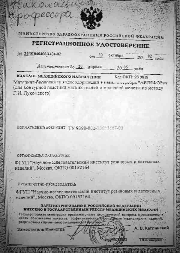 Обсуждали т.н. протезы синовиальной жидкости для внутрисуставного введения при артрозах. Александр Ельцин отправил инструкцию к отечественному такому снадобью (Нолтрекс), из которой видно, что он состоит из препарата "Аргиформ". А в регистрационном удостоверении на этот "Аргиформ" сказано, что это материал "для контурной пластики мягких тканей и молочной железы". Вот такой он, оказывается, универсальный.