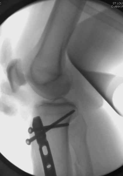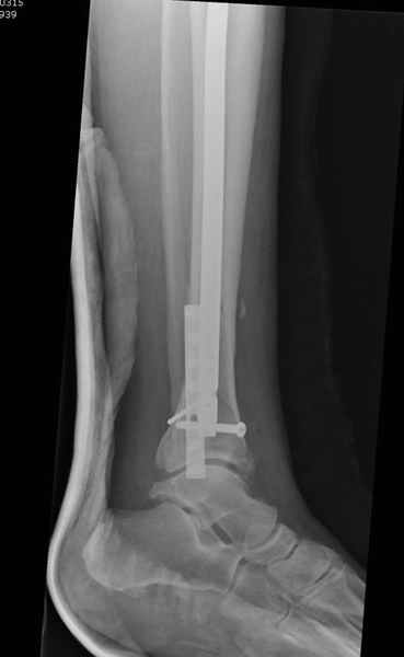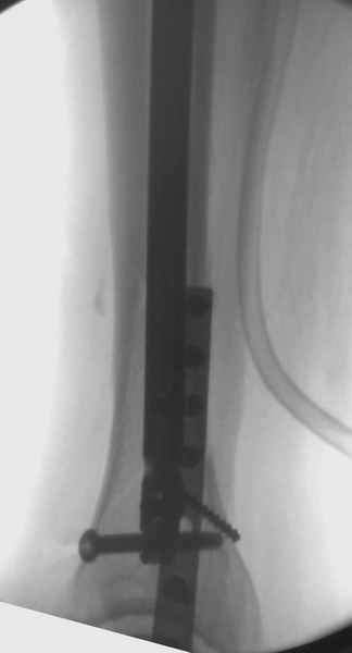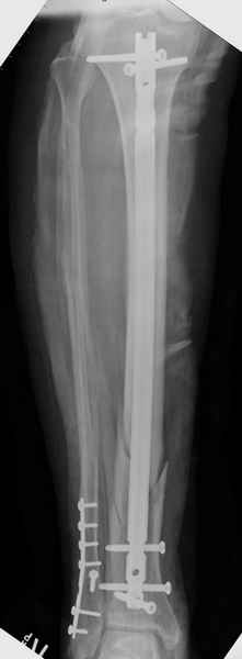 Здесь мы использовали новый Synthes Nail с дополнительными дырками, в проксимальной части 4: по две косых и поперечные (один стандартный а другой динамический), в дистальной части две поперечные, прямая и косая. Вес больного более 120 кг, нагрузку начнем через месяц.
