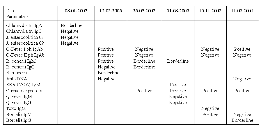 Уважаемые коллеги! Вопрос по уточнению диагноза. Методы дополнительной диагностики? Вашемнение по данному случаю?Спасибо! Жалобы на сильные боли в суставах и мышцах (без четкой локализации), припухлость суставов, повышение температуры 38-39 гр. Считает себя больной с 1994 г., когда появились боли в легких. В 1996 г. - боли в спине без четкой локализации. 2002 г. - роды, через 10 мес. сильные мышечные боли. 2004 г. - плеврит и увеит (сейчас - миопия, -1,-1,5, астигматизм). Периодические увеличения лимфатических узлов (чаще шейных), симптомы васкулита. Диагноз: Ревматоидный артрит неизвестной этиологии (реактивный урогенитальный артрит или полиартрит?) Получает лечение преднизолоном. Биопсия костной ткани - инфильтрация клеточными элементами. Ro грудной клетки - норма. Белки крови Общий белок - 68; (норма - 6,5-8,5) Albumin - 621 (норма - 56,6-66,8) a1-globulin - 3,4 (норма - 3,0-5,6) a2-globulin - 10,3 (норма - 6,9-10,5) b-globulin - 19,0 (норма - 7,3-12,5) g-globulin - 5,2 (норма - 12,8-19,0) Albumin/Globulin - 1,6 (норма - 1,3-2) Общий анализ крови 24.08.05. Hg 130, Э.4,0, ЦП 0,97, Т.77%, Л.14,8, п.8, н.82, э.1, л.4, м.5, СОЭ 49 Иммунология - в отдельном файле Эхокардиография. Утолщение створок митрального клапана. Митральная регургитация (+) без гемодинамических нарушений. Из мазка гортани в 2004 г. высеяны b-hemolytic streptococcus, Staphylococcus aureus и грибок УЗИ внутренних органов и трансвагинальное. Киста правого яичника С уважением, А.В.Владзимирский < | >