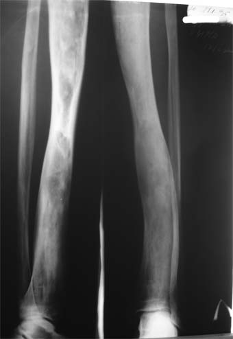 из Коллеги! Пациент Д., 35 лет, В 1985 году был поставлен диагноз гемигипоплазия правой нижней конечности. Укорочение 5 см, в 1987 году остеотомия правого бедра, аппарат 4 месяца, удлинили на 2 см из-за нагноения спиц аппарат сняли. В настоящее время Жалобы на дискомфорт, тяжесть в левом бедре, голени при длительной ходьбе, при длительном лежании на левом бедре. Эти жалобы беспокоят втечение 5-6 лет. В 1999 году выявили "изменения" (со слов больного, выписки нет на руках) бедренной кости и костей голени слева. Тогда же предложили в ЦИТО срочно делать какую-то операцию. При осмотре: Правая нижняя конечность. Имеются рубцы на правом бедре по наружной и внутренней поверхностям. Ограничения движений в коленном суставе нет. Кровоснабжение, иннервация сохранены. Левая нижняя конечность. Левое бедро увеличено в объеме, при пальпации пальпируется бедренная кость большего диаметра по сравнению с левым бедром. Пальпация безболезненна. Голень обычной формы. Объем движений в суставах полный. Кровоснабжение, иннервация сохранены. Имеется разница в длине конечностей правая короче на 4-5 см за счет бедра и голени. В приложении вид больного и рентгенограммы бедра 2001 год и 2005 год.