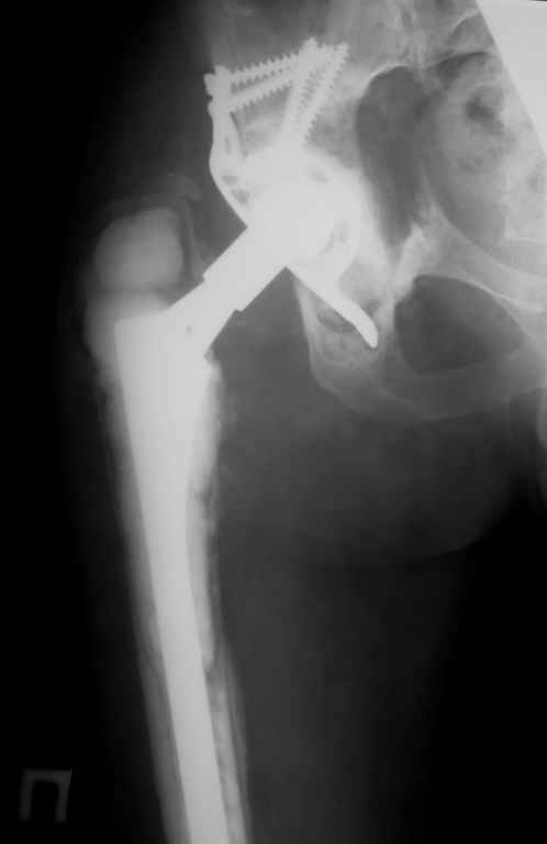 Мы установили временный протез предназначенный только для движений и ходьбы без нагрузки. "Старый" цемент мы не удаляли поэтому спустя 3-4 месяца планируется выполнить расширенную остеотомию бедра с удалением всего к/цемента и установкой ножки бесцементной фиксации. Обязательным условием является хорошая дистальная фиксация на протяжении минимум 6-8 см. Скорее всего мы используем изогнутую ножку длиной 254 мм, это будет либо ZMR, либо Solution, я еще не планировал этот этап операции.