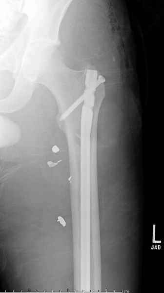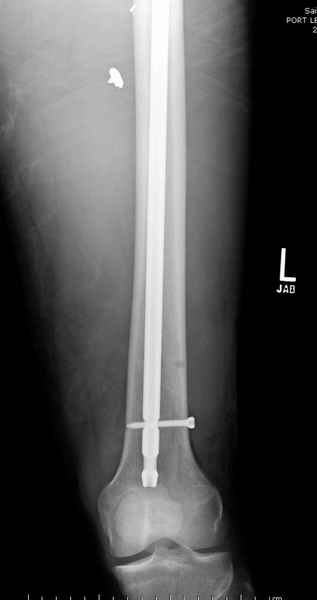 Учитывая, что больной получил травму не во время визита в церковь, и он является одним из представителем 40 миллионного “outstanding itizen”, без медицинской страховки, без работы в свои 39 лет, и без надлежающей ортопедической дисциплины у которого отсутсвует страх стрессового перелома, было рекомендовано оперативное лечение: профилактическое антеградное интрамедуллярное штифтование.