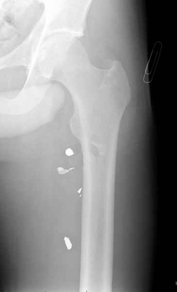 Методика штифтования при отсутствии большой зоны перелома как при онкологических профилактических штифтованиях, расверливание интрамедуллярного канала проводим с предварительным наложением дополнительного дренажного отверстия в дистальном отделе бедра (в данном случаи в канале оставили 6.5 мм канюлированный шуруп), иначе при создании давления в канале во время сверления имеется опасность эмболизации легочной артерии тромбом.