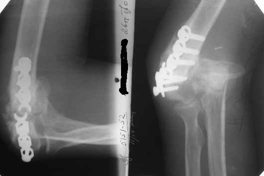 The recent x rays show established Non union with poor quality bone in the distal fragement. The joint is also appearing degenerate. In view of the multiple failed reconstructive surgeries, an Elbow replacement would seem reasonable.