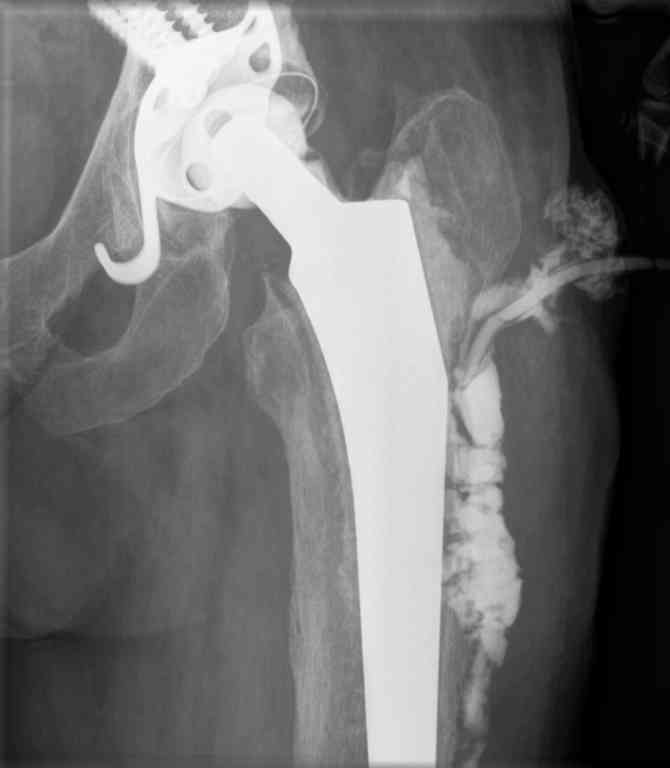 Уважаемые коллеги.Подскажите, пожалуйста, варианты ревизии у пациентки 65 лет с нагноением эндопротеза т\б сустава. В 2004 году установлен эндопротез с гладким п\о течением и заживлением раны. На протяжении всего времени больную беспокоили боли в области паха: бедра. Поступила с обстрением болевого синдрома и уже в отделении развился покожный абсцесс с формированием свища. Фистулография- в приложении. Достаточно ли удалить протез и установить промывную систему или лучше спейсер? Если спейсер, тогда как дренировать костномозговой канал? Спасибо.