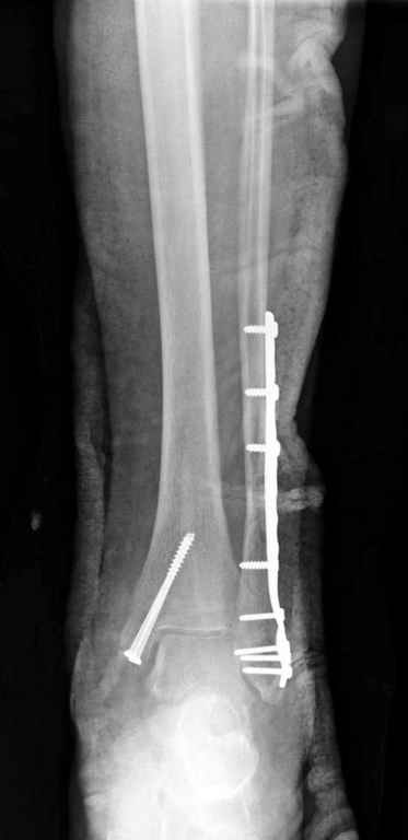 два 4.5 мм спонгиозных винта. Почему я задаю вопрос, потому что во всех оперирируемых случаях наблюдал надкостничную интерпозицию в зоне перелома внутренней лодыжки, которая устраняется в процессе репозиции. Естественно, что при закрытой технике устранить интерпозицию евозможно/возможно? или сохраняющаяся межфрагментарная интерпозиция не кртитична для сращения перелома? Как вы прокомментируете это?