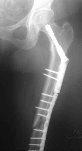 Перелом синтезированный DHS сросся, а вот на уровне средней трети - нет. И, похоже, есть нехорошая тенденция к резорбции.
