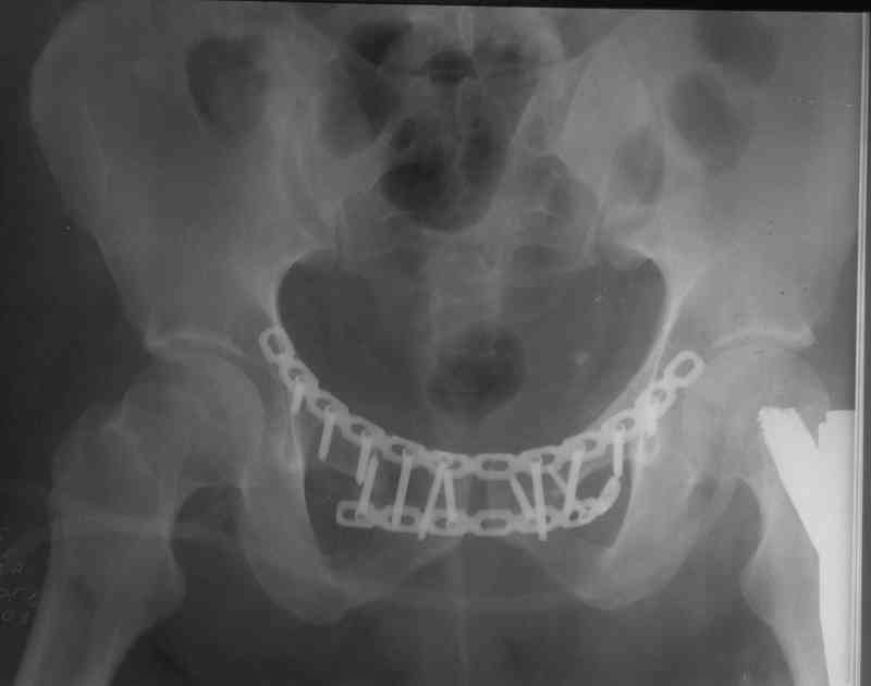 с недельным интервалом - стабилизация таза. Пациент оказался активным по своей природе, как только переломы были фиксированы, начал передвигаться с костылями. Нестабильное повреждение тазового кольца в сочетании с переломом лодыжки справа и переломом бедра слева не создавало возможности ограничения осевой нагрузки на н/к, поэтому и возникала дилемма как быстро его можно ставить на костыли. По словам пациента, послеоперационные боли были незначительны, больной, несмотря на возраст -58 лет атлетического телосложения, с хорошо развитой мускулатурой и отсутствием лишнего веса + желание выбраться из койки поскорее и пойти домой - всё вместе и способствовало ранней активизации.