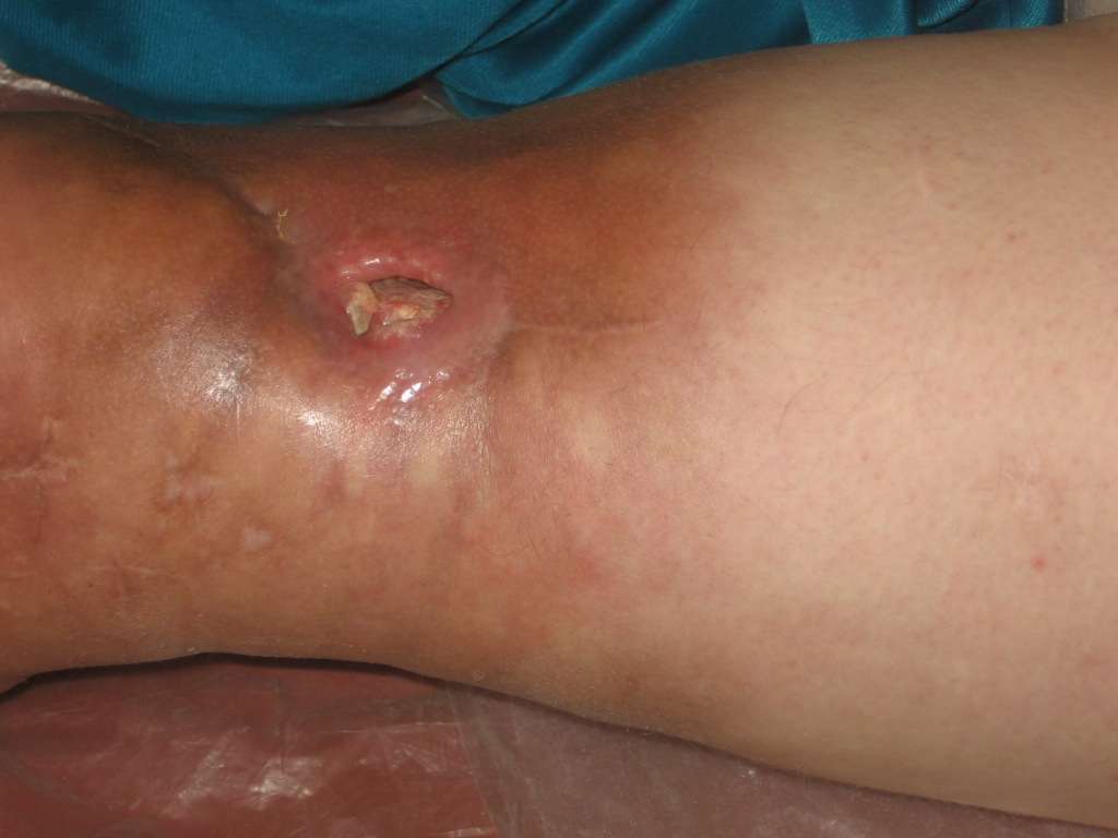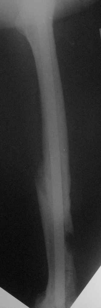 1.5 года назад произведен синтез для улучшения качества жизни для по поводу патологического перелома на уровне открытой биопсии. Через 4 месяца открытый реостеосинтез с исправлением оси и восстановления опроспособности. В период после перелома лучевой и химиотерапии не получала. Месяц назад появилсь возрастающие боли в суставе. Ходит с тростью. Движения в коленном суставе качательные.На рентгеннограммах после реостеосинтеза намечалась тенденция к сращению. В области операционной раны периодически открывался-закрывался свищ. На последних - кроме миграции гвоздя в сустав - лизис костной мозоли. Можно ли одной из причин миграции считать длительную статическую фиксацию гвоздя? У кого-нибудь есть опыт на каких сроках проводить у онкобольных динамизацию? Что можно сделать для ликвидации боли и поддержания опороспособности конечности? Имеет ли смысл установка более толстого фиксатора без дистального блокирования? И вообще,ставить ли здесь вопрос о сохранении конечности?
