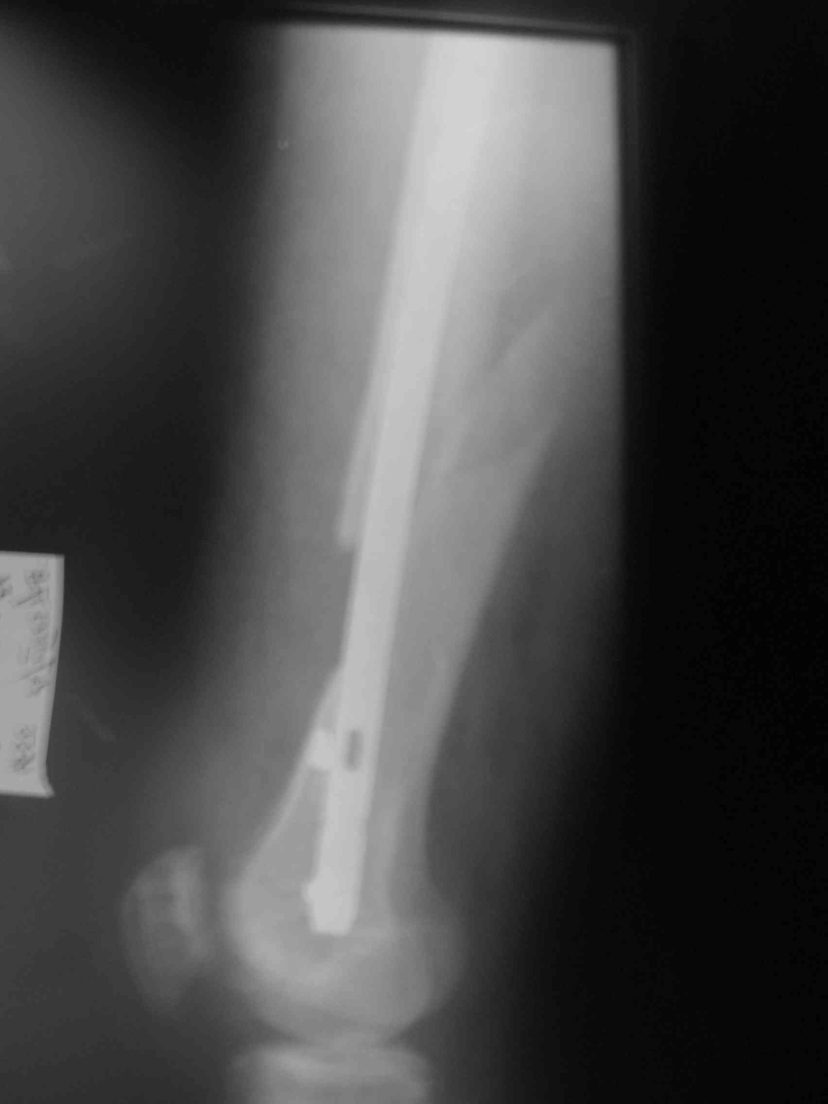 1.5 года назад произведен синтез для улучшения качества жизни для по поводу патологического перелома на уровне открытой биопсии. Через 4 месяца открытый реостеосинтез с исправлением оси и восстановления опроспособности. В период после перелома лучевой и химиотерапии не получала. Месяц назад появилсь возрастающие боли в суставе. Ходит с тростью. Движения в коленном суставе качательные.На рентгеннограммах после реостеосинтеза намечалась тенденция к сращению. В области операционной раны периодически открывался-закрывался свищ. На последних - кроме миграции гвоздя в сустав - лизис костной мозоли. Можно ли одной из причин миграции считать длительную статическую фиксацию гвоздя? У кого-нибудь есть опыт на каких сроках проводить у онкобольных динамизацию? Что можно сделать для ликвидации боли и поддержания опороспособности конечности? Имеет ли смысл установка более толстого фиксатора без дистального блокирования? И вообще,ставить ли здесь вопрос о сохранении конечности?