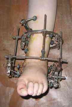 Уважаемые коллеги. Тема обсуждалась: Прошу прощения за задержку с ответом. Женщину прооперировал. Из внутреннего доступа удалена внутренняя лодыжка, из наружного отсечена от рубцов латеральная, из обоих параллельно предыдущей остеотомии экономно произведена резекция "суставных" поверхностей ББК и тарана до "кровавой росы", удалены все рубцы, стопа выведена, провизорная диафиксация спицами. Далее аппарат, однако, после удаления диафиксирующих спиц и компрессии, произошло наружное смещение тарана. Но и так время операции составило почти 4 часа, поэтому через неделю пришлось маленько подработать аппаратом. Итог на снимках (извиняю сь за качество). Не совсем все нравится - в литературе намного красивее. Только один вопрос к уважаемому форуму: что действительно необходимо подправить? Спасибо. С уважением, А.Минервин.