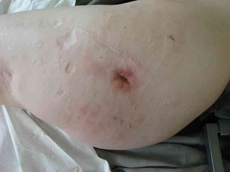 В качестве демонстрации лечения канального остеомиелита бедренной кости представляем пациентку (см. parts 2 и 3), которая как раз сегодня была у нас на контрольном осмотре. В мае этого года мы произвели ей фиксацию бедренной кости штифтом-спейсером по поводу ложного сустава и канального остеомиелита бедренной кости. Через 4 недели после операции свищи закрылись. Сейчас она ходит с полной нагрузкой на конечность.