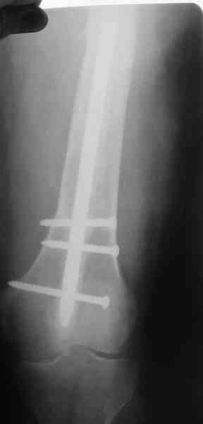 В настоящее время наш пациент ( см. http://weborto.net/forum/1177351385/) ходит с одним костылем. У него периодически открывается свищ на задне-наружной поверхности бедра с умеренным серозно-гнойным отделяемым. Температура тела и анализы нормальные. На рентгенограммах имеются признаки консолидации ложного сустава.