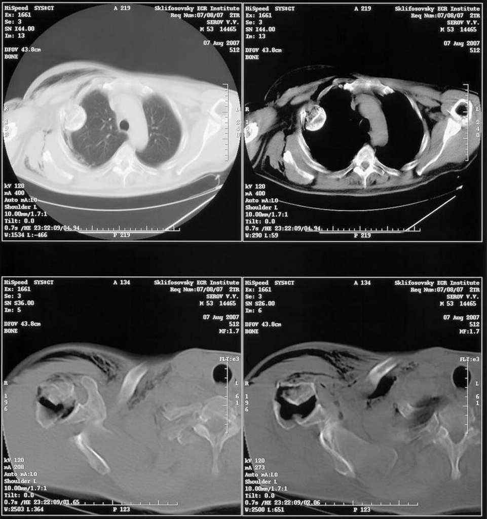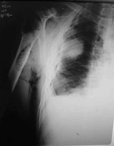 Правый плечевой сустав умеренно деформирован. По внутренней поверхности плеча имеется кровоподтек. При пальпации плечевого сустава имеется умеренная болезненность. Активные и пассивные движения болезненные. Снижена чувствительность по тыльной поверхности пальцев кисти и отсутствует активное разгибание кисти и пальцев. Имеется подкожная эмфизема шеи, верхней половины грудной клетки (рис 1, 2). На рентгенограмме: оскольчатый перелом головки плечевой кости со значительным смещением, перелом 2-3 ребер справа, тканевая эмфизема (рис 3). КТ при поступлении: перелом головки плечевой кости в области анатомической шейки со смещением отломка головки в грудную полость, правосторонний гидроторакс, перелом 2-3-4 ребер справа. (рис 4). Через двое суток после поступления выполнена операция: атипичная торакотомия, эвакуация свернувшегося гемоторакса, удаление инородного тела (головки плечевой кости) из плевральной полости (при этом выявлено имеющееся повреждение париетального и висцерального листков плевры) (рис. 5), дренирование плевральной полости, замещение проксимального конца плечевой кости спейсером из костного цемента с антибиотиком (рис. 6). Послеоперационный период протекал гладко. При контрольной рентгенографии положение спейсера удовлетворительное (рис. 7, 8). Дренаж из плевральной полости удален через 3 суток после вмешательства. Послеоперационная рана зажила первичным натяжением. Через 12 дней после операции больной выписан на амбулаторное лечение.