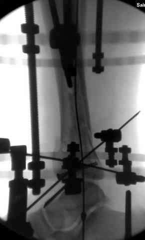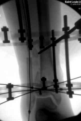 Наружным фиксатором обеспечивается длина конечности, предупреждается вторичное сокращение мягких ткани, что является немаловажным фактором для заживления послеоперационных ран. Без фиксатора сокращенные мягкие ткани легко травмируется во время манипуляций, трудно будет провести репозицию, ухудшается местное кровообращение и сохраняется посттравматический отек.