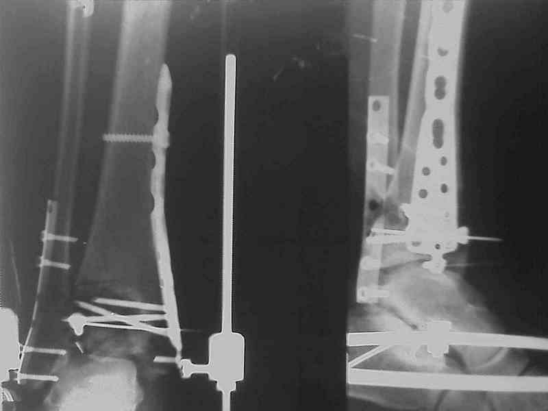 Снова приветствую вас, коллеги. К моменту вступления в обсуждение аксакалов, операция была, увы, выполнена(31.10.07.) Начали с доступа к наружной лодыжке, произвели ее фиксацию спицами, развернули кусок заднего края, наложили дистрактор, затем произвели дистракцию, фиксацию спицами дистального эпиметафиза б/бк,Рентгено-контроль. синтез наружной лодыжки 1/3пластиной. из двух коротких разрезов сформирован канал под медиальную тибиальную пластину LCP. Края ран ушиты без натяжения. Прочувствовать жесткость фиксации винтами с угловой стабильностью не удалось, поэтому дистрактор оставлен на энное время.