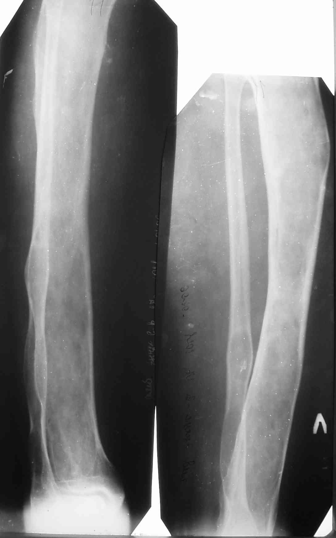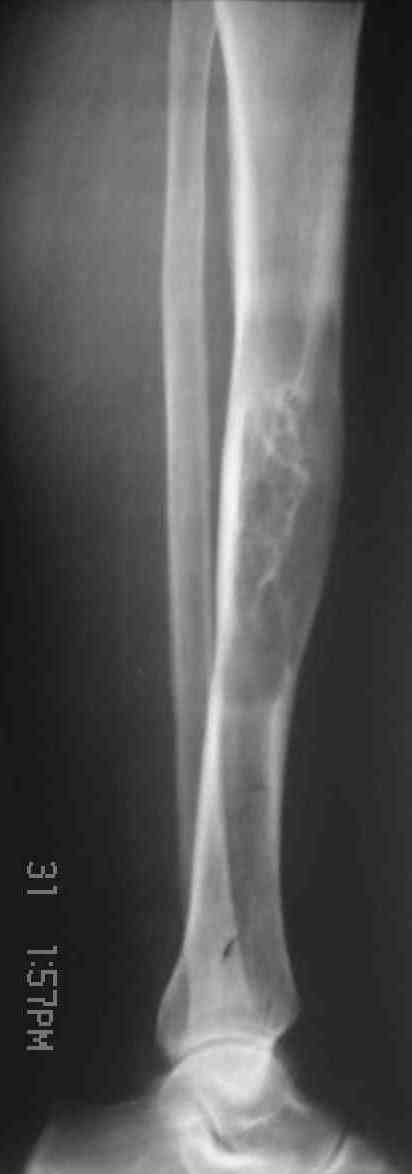 В анамнезе хроническая травматизация. Заметила месяца три назад, не болит. Кожа над образованием не изменена. Рентгенограммы прилагаются. Наша военно-научная мысль бьется в направлении резекции кости в пределах здоровых тканей,фиксации блокированным стержнем с последующим выращиванием костного регенерата. Или лучше выполнить краеву резекцию, эксколхеацию и пластику дефекта (предварительно верифицировав диагноз при помощи трепан-биопсии)? Есть некоторые сомнения, что это действительно ОБК. Хотелось бы ваше мнение. Алексей.