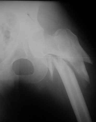 Мы закончили репозицию отломков бедренной кости в аппарате (рис. 1, 2) у нашей пациентки и на прошлой неделе сделали ей вторую операцию. Штифт удалось ввести закрыто. Верхний шеечный винт держался очень плохо, поэтому мы его убрали и решили не ставить. Нижний держал очень плотно. Рентгенограммы после операции прилагаю (рис. 3,4). Пока не получилось сделать нормальный аксиальный снимок (больная с трудом сгибает и отводит ногу в тазобедренном суставе). Пока сделали боковую проекцию в положении на здоровом боку со сгибанием здоровой ноги.
