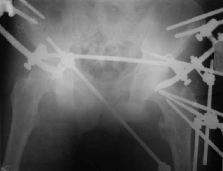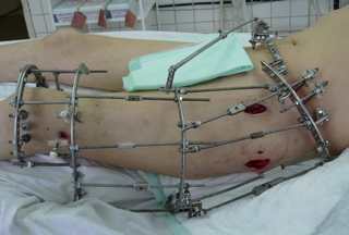 больной крайне тяжело переносит наличие аппарата. Если после операции он при помощи инструктора ЛФК стоял у кровати, то сейчас категорически отказывается это делать из-за боли в области стержней. Пациент психологически подавлен, пассивен, вял. В области стержней, проведенных через крылья подвздошных костей имеется выраженное воспаление мягких тканей.