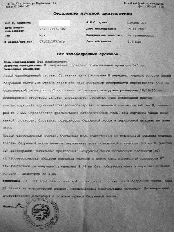 Мне представляется, что предоставлен случай аваскулярного некроза головки бедра. Для определения тактики лечения необходимо выполнить ренгенограммы лучшего качества и посмотреть все срезы на уровне головки. Предоставленные срезы -уровень ямки,т.е. малонагружаемой зоне, наличие в этой зоне участков сегментарного некроза скорее всего не приведет к деформации головки, при таком варианте разгрузка конечности на 3-4 мес может привести к благоприятному исходу.