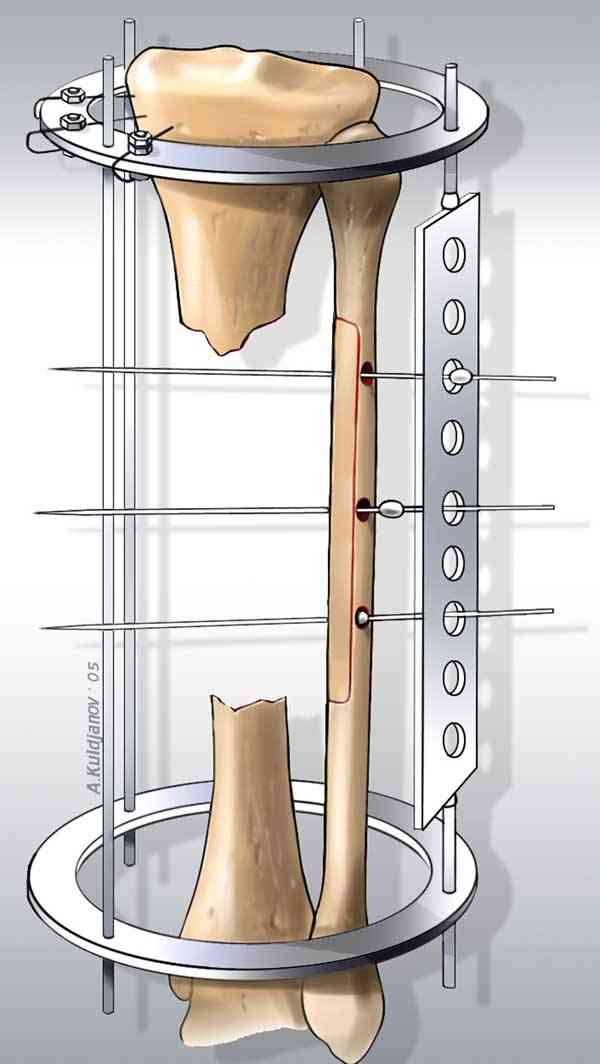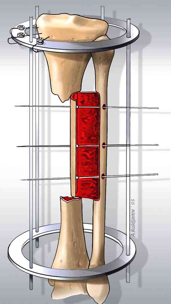 Недостаток костной массы можно заместить расширением малоберцовой. На небольшое расстояние можно передвинуть медиальный кортекс малоберцовой в аппарате. Отрицательным моментом техники является продольная остеотомия малоберцовой.