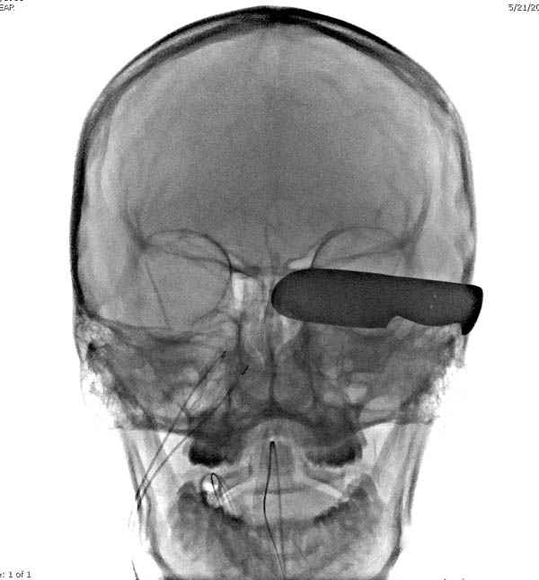 Уважаемые коллеги,Основную массу ургентной травмы в крупных городах Америки оказывают в центрах Травмы Первого Уровня. Ну не так как в популярных телесериалах типа "Emergency Room", но общая атмосфера похожая, где кроме травмы скелета принимаются все остальные ургентные случаи. В своих выступлениях я рассказывал, что наши центры в мирное время по пенетрирующим травмам не уступает Ираку или Афганстану, и вот недавно к нам поступила больная 22 лет, травма "ножом в глаз" от бывшей подруги нынешнего "бой френда". При поступлении в сознании, жаловалась на неприятные ощущения в глазнице. По протоколу сделаны все необходимые исследования: рентген, ангиограмма с 3Д реконструкцией, где обнаружили что все жизненно важные сосуды не задеты, даже некоторые "сидят" изгибаясь на ноже. Одним махом нож удалить не удалось, пришлось раскачать и потом двумя руками удалили нож. Рана без кровотечения, обработана и зашита.