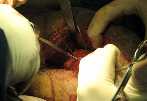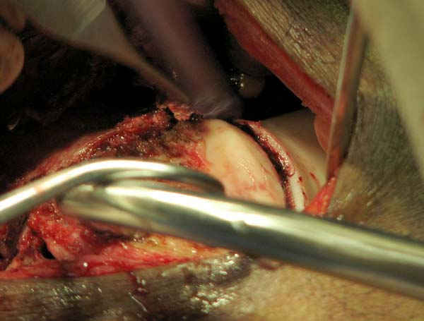 Здесь применен рутинный метод лечения огнестрельных переломов, т.е. рана теоретически чистая, что противоречит принятым ранее догмам . По принятой тактике, при огнестрельных переломах назначаются антибиотики Ancef 1gm каждые 8 часов внутривенно в течение 24 часов. Желательно первую дозу ввести непосредственно перед разрезом.