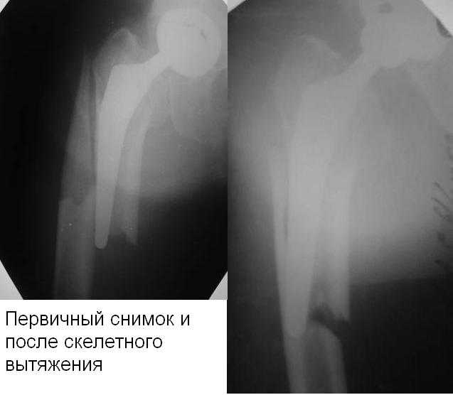 Произведено закрытое удлинение ножки эндопротеза с помощью ретроградного интрамедуллярного стержня. Продолжительность операции 3 часа. Два из них закрытое восстановление длины бедра диистрактором