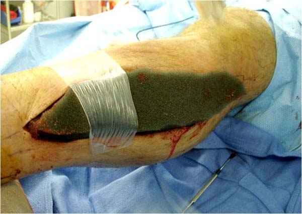 После расширенного доступа к фасции, разрез закрываем ваккуумной повязкой (VAC), которая облегчает уход и предупреждает осложнения. Вакуумирование уменьшает дальнейшее сокращение кожи и облегчает закрытие раны.