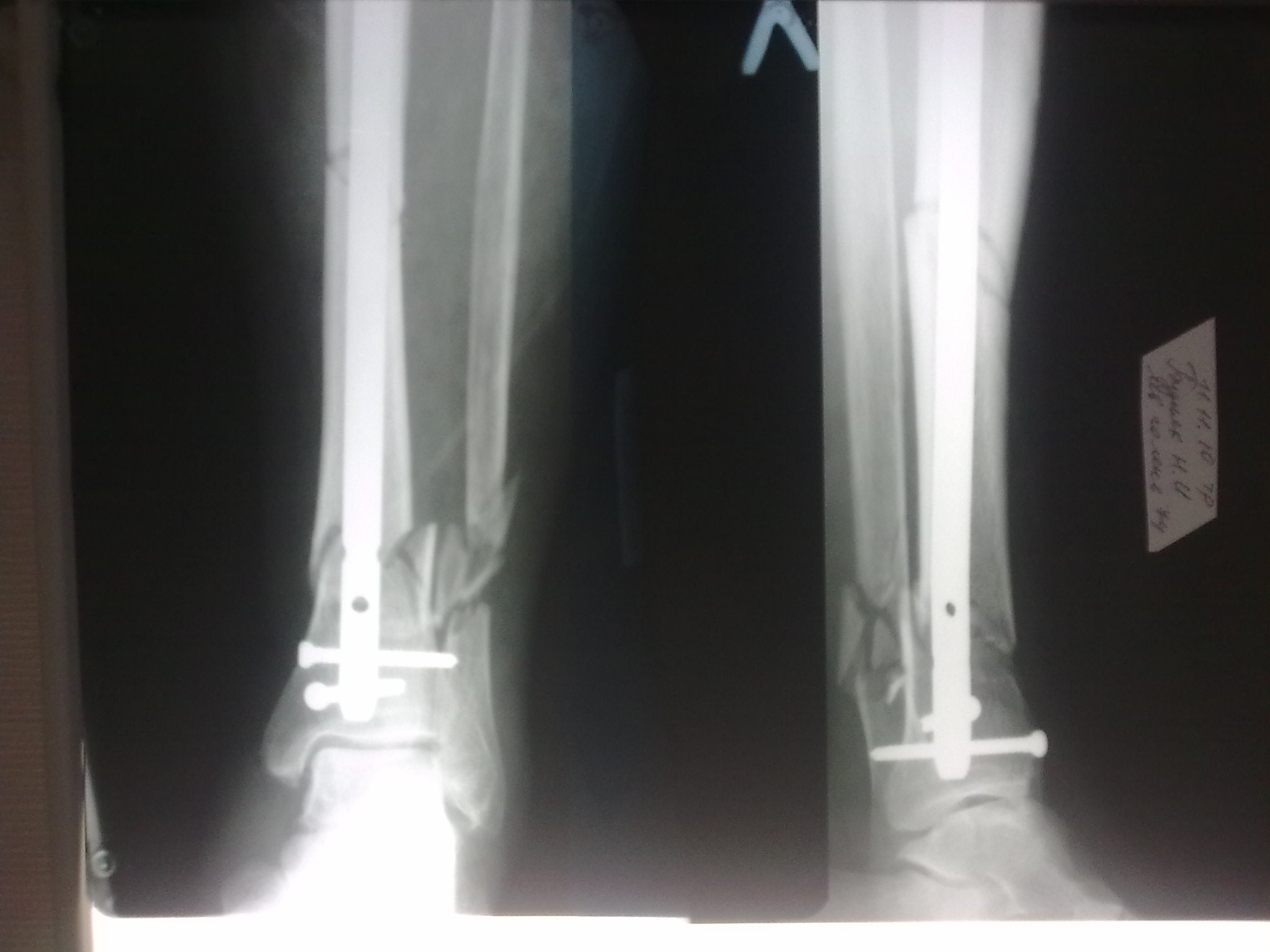 Открывали дистальный перелом - для качественной репозиции - у нас нет ЭОПа. Остеопороз у пациента - намного более выражен, чем у других пациентов-мужчин данной возрастной группы. По данным некоторых зарубежных авторов, при переломе обеих костей голени на одном уровне рекомендуется фиксация обоих. Руководитель нашей клиники настоятельно рекомендует фиксировать обе кости голени при повреждении на одном уровне. А в данном случае, учитывая выраженный остеопороз, у нас в отделении возникла дискуссия о необходимости дополнительной внешней иммобилизации у данного пациента для предупрежения прорезывания блокирующих винтов и вальгусного отклонения дистального отломка за счет силы латеральной группы мышц и отсутствия латеральной опоры на фоне выраженного остеопороза.