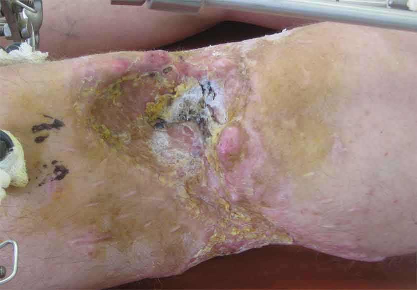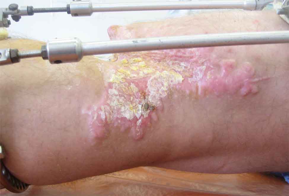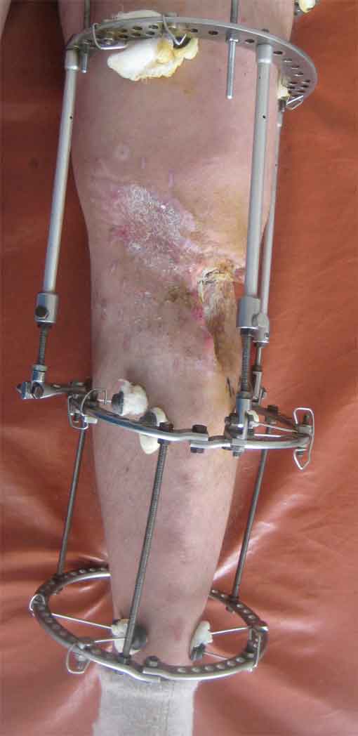 Производственная травма. Лечился в гнойной хирургии - обширные раны голени. 7 мес пребывания в аппарате (на фото), по УЗИ - тромбоз глубоких вен с признаками реканализации.