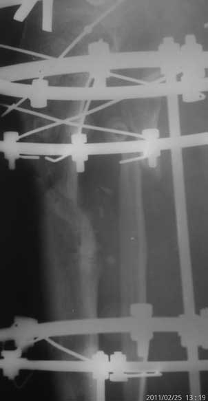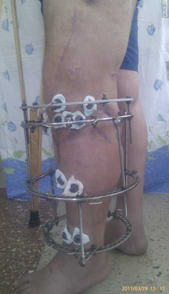 Уважаемые коллеги. Хотелось бы услышать Ваше мнение по следующему случаю. На лечении в отделении находится пациент 45 лет. С диагнозом: Замедленно консолидирующийся надмыщелковый перелом левой бедренной кости фиксированный пластиной от 06.12.10. Ложный сустав большеберцовой кости левой голени фиксированный АНФ от 06.12.10. Жалобы: на невозможность активного сгибания в левом коленном суставе, нарушение опорной функции левой нижней конечности, укорочение левой нижней конечности на 5,0 см. Анамнез: травма 18.06.10 в результате ДТП, водитель. Диагноз: Сочетанная травма головы, конечностей. ЗЧМТ. Сотрясение головного мозга. Открытый многооскольчатый внутрисуставной перелом мыщелков и нижней трети левой бедренной кости со смещением отломков. Открытый перелом костей левой голени в верхней трети со смещением отломков. Обширные рвано – ушибленные раны левого бедра, верхней трети левой голени. Находился на лечении в нескольких стационарах, где проводились оперативные вмешательства. 1. 18.06.2010 г. - ПХО открытого перелома костей левой голени, фиксация переломов костей левого бедра, голени в АНФ. 2. 08.07.2010 г. перемонтаж АНФ на левом бедре, голени, хирургическая обработка ран левой голени 3. 13.07.2010 г. кожная пластика гранулирующей раны левой голени перемещенным кожным лоскутом и свободная кожная пластика расщепленным кожным лоскутом. 4. 27.07.2010 г. перемонтаж АНФ на левом бедре, голени, вторичная хирургическая обработка ран левой голени. 5. 09.08.2010 г. – свободная кожная пластика гранулирующей раны левой голени. 6. 01.12.2010г.: Демонтаж АНФ с левого бедра, голени. 7. 06.12.2010г. Открытая репозиция, остеосинтез чрезмыщеково – надмыщелкого перелома левой бедренной кости пластиной со свободной костной пластикой из гребня левой подвздошной кости (во время операции из за сомнений в жизнеспособности костного отломка перелома бедра произведено его удаление. За счет чего образовался дефект костной ткани и укорочение левого бедра на 5,0 см; Мыщелки бедра были в сгибание, 5 месяцев нога не опорная, при попытке их репонировать крошились , зафиксировали как стояли. Остеосинтез переломов костей левой голени в АНФ. Местно: Ходит при помощи костылей с попыткой полной нагрузки на левую ногу. Левый коленный сустав в положении разгибания. Движения в коленном суставе качательные. Воспалительных явлений области послеоперационных рубцов, мест выхода спиц нет. Анализы крови без воспалительной реакции. На сегодня: с момента травмы прошло 10 месяцев. Вопрос, что делать: 1. С бедром. 2. С голенью. 3. С коленным суставом. Мысли: №1. Оперативное лечение провести в два этапа. В первый этап голень, второй этап через 1 месяц бедро и коленный сустав. Голень: выполнить остеосинтез левой большеберцовой кости интрамедуллярным стержнем с рассверливанием. На основании боковой рентгенограммы коленного сустава мыщелки бедра в сгибании, голень в переднем подвывихе, создается впечатление, что удастся завести стержень при такой контрактуре, или выполнить отсечение бугристости, попытаться согнуть колено и заштифтовать. Есть ли опыт штифтования при стойких контрактурах? Бедро, коленный сустав: через 1 месяц срединным доступом с отсечение бугристости большеберцовой кости произвести реостеосинтез надмыщелкого перелома бедра с выведением мыщелков из сгибания. Коленный сустав: мобилизация головок четырехглаво