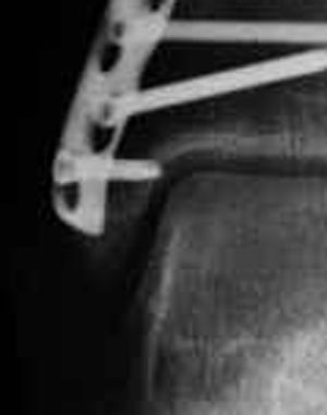 самый дистальный шуруп насквозь через внутреннюю лодыжку в сустав ( см увеличенный рисунок). Хорошо было бы его убрать - стабильности остеосинтезу он совершенно не добавляет.